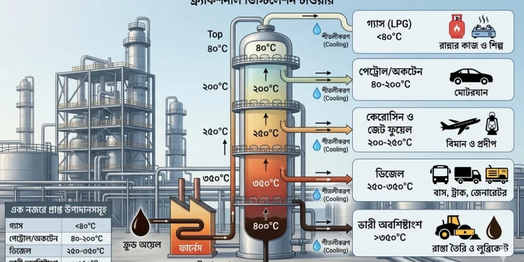 ক্রুড অয়েলকে একটি বিশালাকার জারের ভিতরে ঢুকিয়ে, প্রেশার কুকারের মত ৪০০ ডিগ্রী সেন্টিগ্রেড তাপমাত্রায় উত্তপ্ত করা হয়। ফলে ক্রুড অয়েল গলে বাষ্প হতে থাকে। সেই বাষ্পগুলো পর্যায়ক্রমে ঠাণ্ডা হবার জন্যে, একটি খাড়া চিমনি দিয়ে পাঠিয়ে দেওয়া হয়। সে সব বাষ্প,