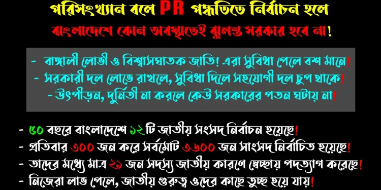 ইতিহাসের পরিসংখ্যান বলে PR পদ্ধতির নির্বাচন হলে বাংলাদেশে ঝুলন্ত পার্লামেন্ট হবার সম্ভাবনা খুবই কম। বাঙ্গালী লোভী ও বিশ্বাসঘাতক প্রকৃতির জাতি। যারা সংসদের যায়, তারা এসব লোভীদেরই সন্তান।